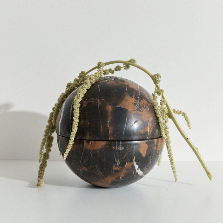 When not in use, this incense sphere offers a perfect spherical shape that highlights the beauty of the natural stone, whether you opt for light hues of Travertine or the deep, contrasting shades of Port Laurent. In both cases, the wonderful, natural variations found in the stone give it a unique quality, highlighting the level of craftsmanship involved in this hand-crafted piece.