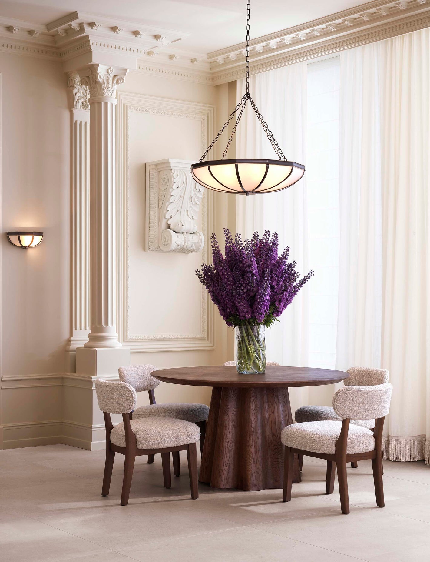 Classic or more formal interiors benefit from substantial tables in marble or wood, often with sculptural bases. High-back chairs, rich fabrics, and warm finishes introduce depth and a sense of tradition.